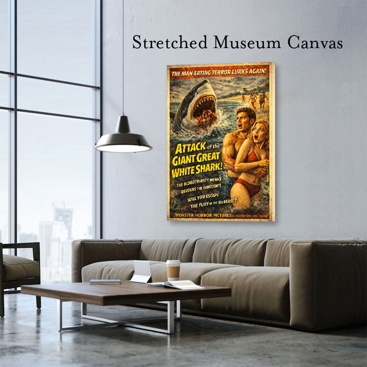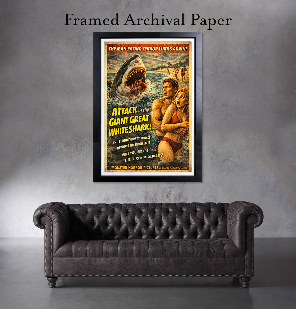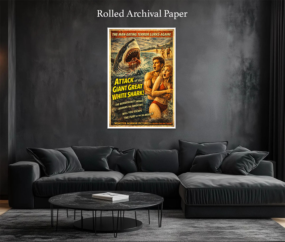 Shark Horror Movie Poster. Jaws Movie Poster. Perfect for Any Space – Add a bold statement to your home theater, office, bedroom, man cave, fantasy or movie art collection, or game room with this horror art décor that evokes true movie artwork nostalgia. Proudly Made in the USA – This high-quality art print is made in the USA, ensuring authenticity, durability, and premium craftsmanship.